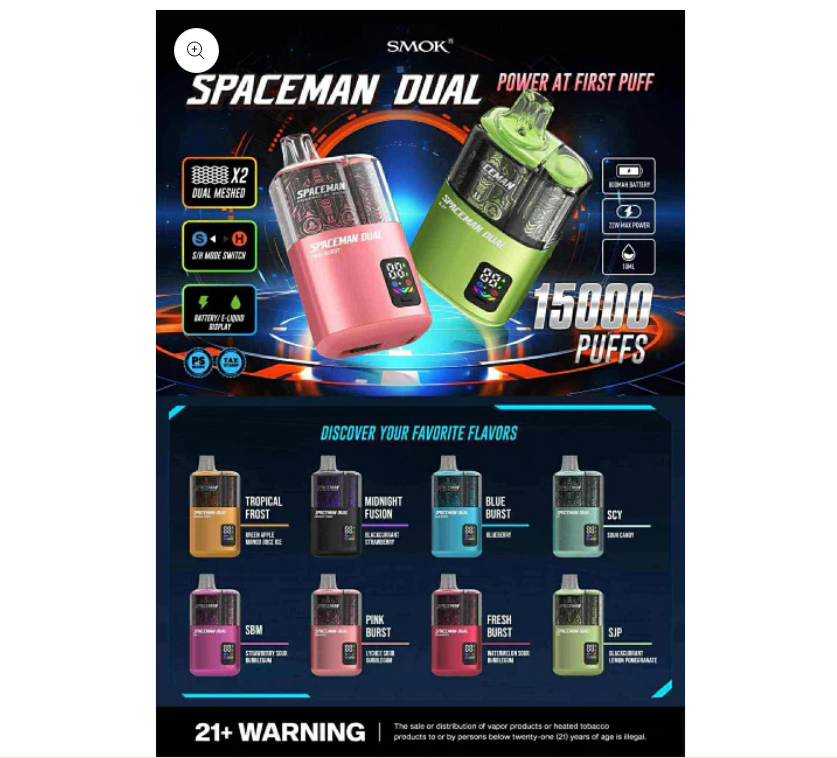 The SMOK Spaceman Dual 15000 is the disposable vape for those who demand more. It combines advanced technology, massive capacity, and tailored performance in a sleek, portable form. Whether you’re after smooth flavor or bold clouds, the Spaceman Dual adapts to you—delivering reliable, premium satisfaction from start to finish.